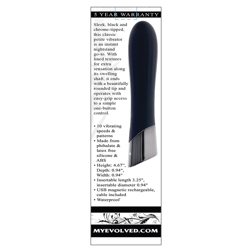 Sleek, black and chrome-tipped, this classic petite vibrator is an instant nightstand go-to. With lined textures for extra sensation along its swelling shaft, it ends with a beautifully rounded tip and operates with easy-grip access to a simple one-button control.